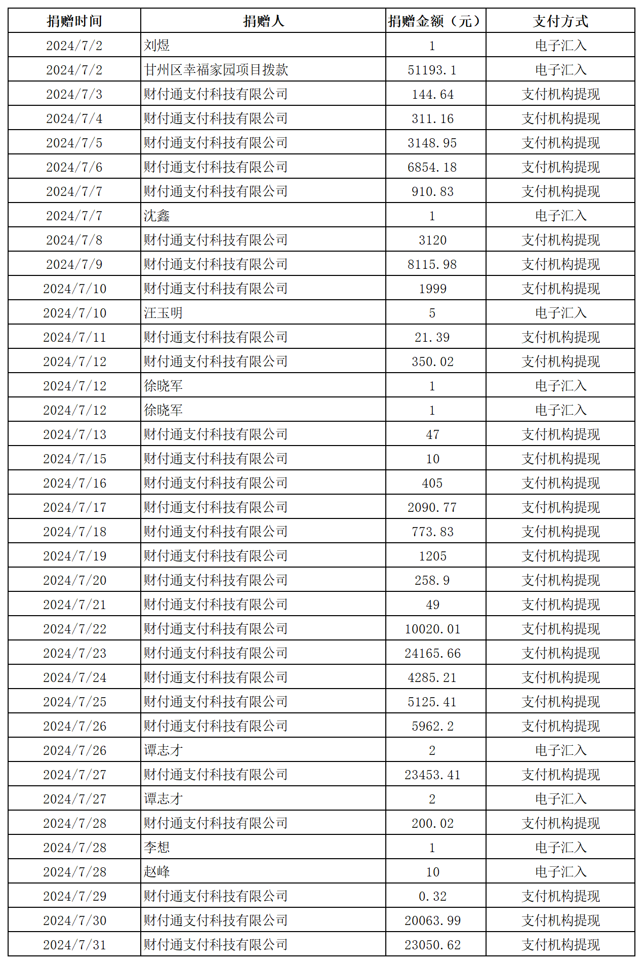 2024年張掖市慈善協(xié)會積極搭建愛心平臺,得到廣大愛心人士和愛心單位積極響應(yīng),踴躍捐款捐物,現(xiàn)將(2024年7月1日--7月31日)接收到的銀行轉(zhuǎn)賬收入公示如下: